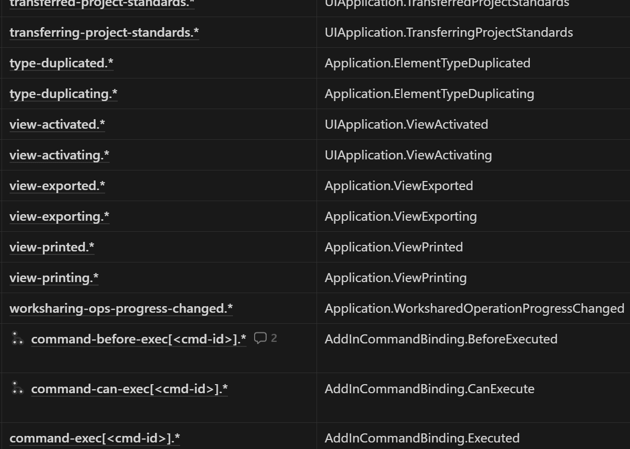 We can create Command Binding Events. This will allow us to monitor commands within Revit and subscribe to them. You can see a list of all commands in PostableCommand Enumeration, it has hundreds if not thosands of commands, so I won't list them here…