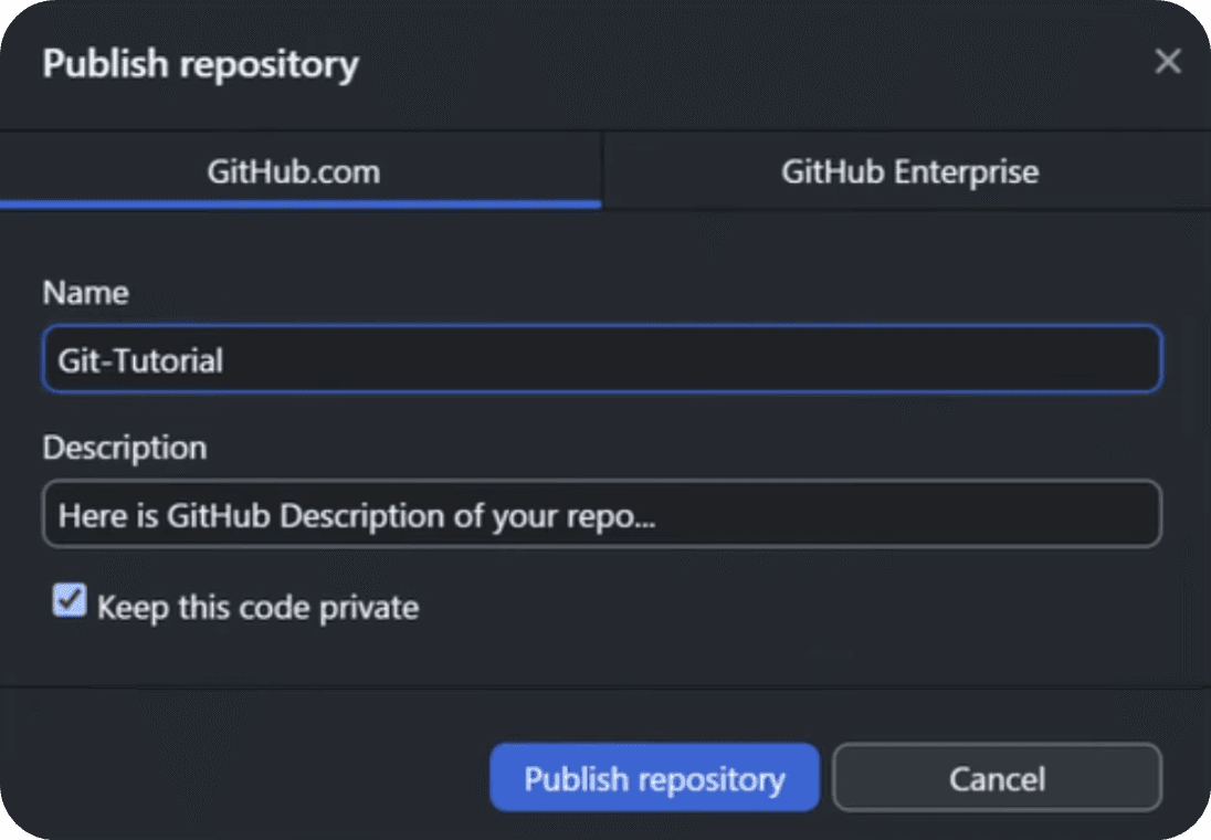 Once you're ready to create a commit, write Commit Message and optional Description that will be shown in Commit History inside your repository.