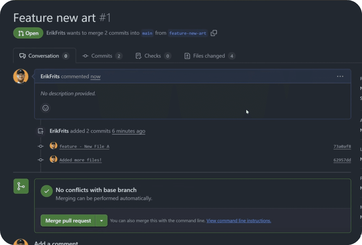 ⚠️Sometimes you might have conflicts between 2 branches because you modified the same file differently. Then you need to figure out which one to keep or how to combine them.