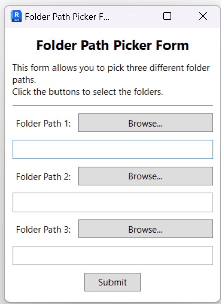 If you ever wanted to ask your users for multiple paths, you can use this custom WPF form.