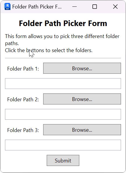I was asked how to ask user for multiple paths, so I created this simple WPF form to capture multiple inputs and display selected paths.